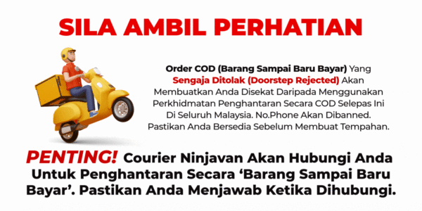 1. Bayar kepada posmen Ninja Van/Dhl setelah anda mendapat order anda 2. Barang akan sampai dalam 1-5 hari bekerja 3. Cas Cod Rm 10 Sahaja Tidak Perlu Ke Bank